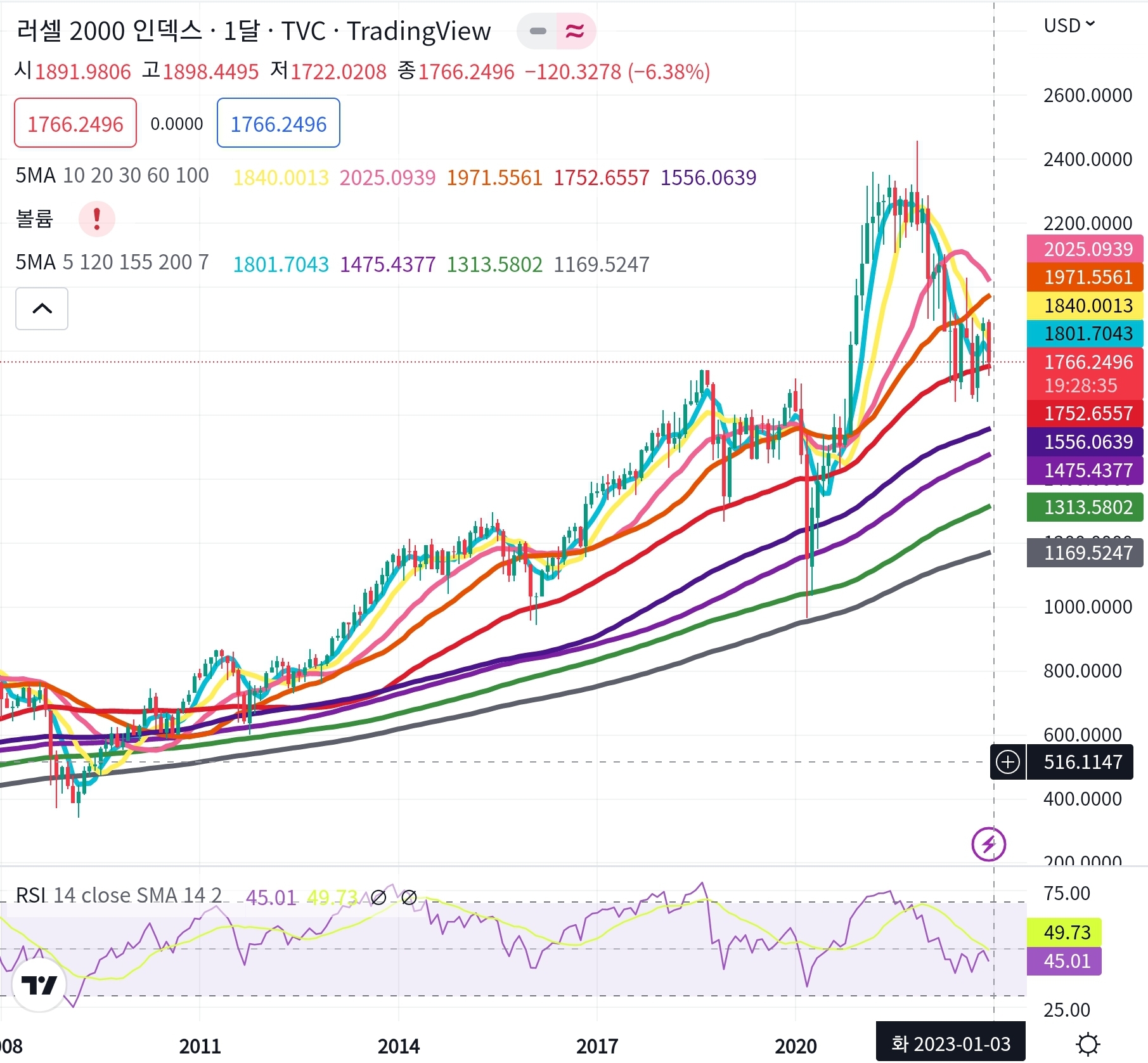 2022년을 마감하는 현재 시점에서 미국 중소형 주들을 대표하는 러셀 지수 확인을 해 보았다.