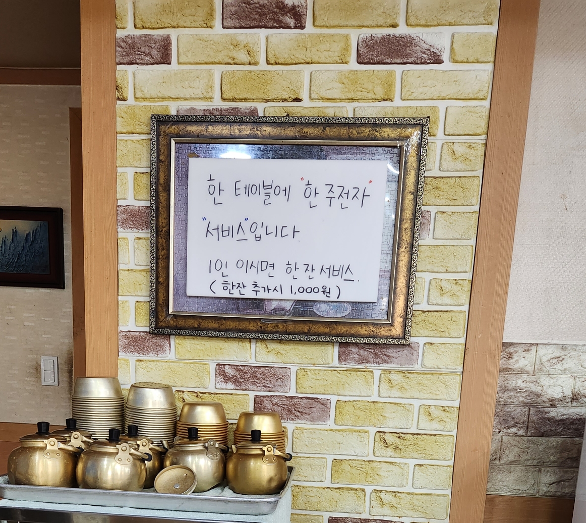 특별하게는 테이블 혹은 1인당 막걸리를 한 주전자 혹은 1잔이 무료로 제공된다. 이미 많은 어르신들은 메뉴를 시키시면서 동시에 갖다드시던데 막걸리를 좋아하시는 분들은 참고할 만 하다.