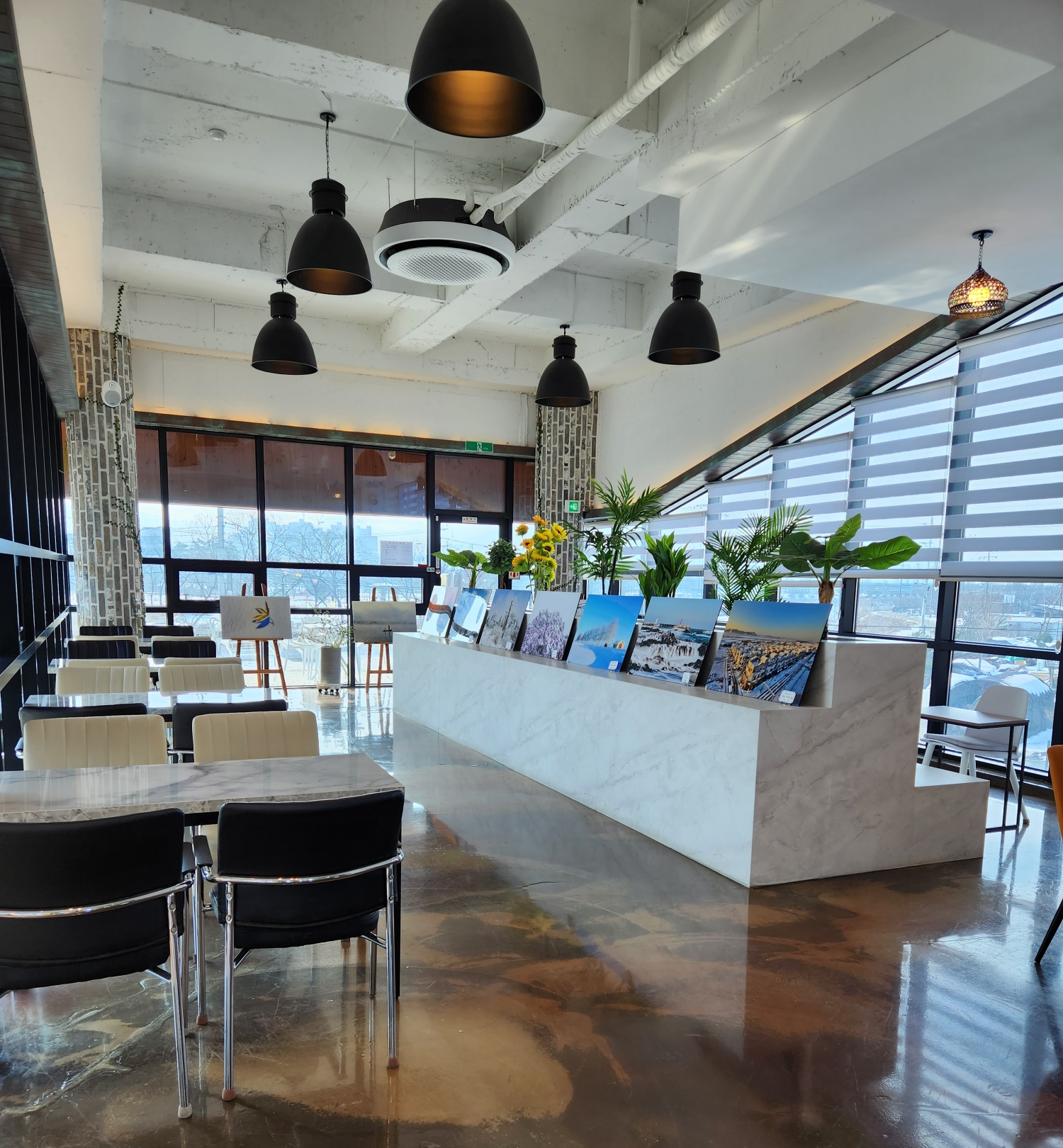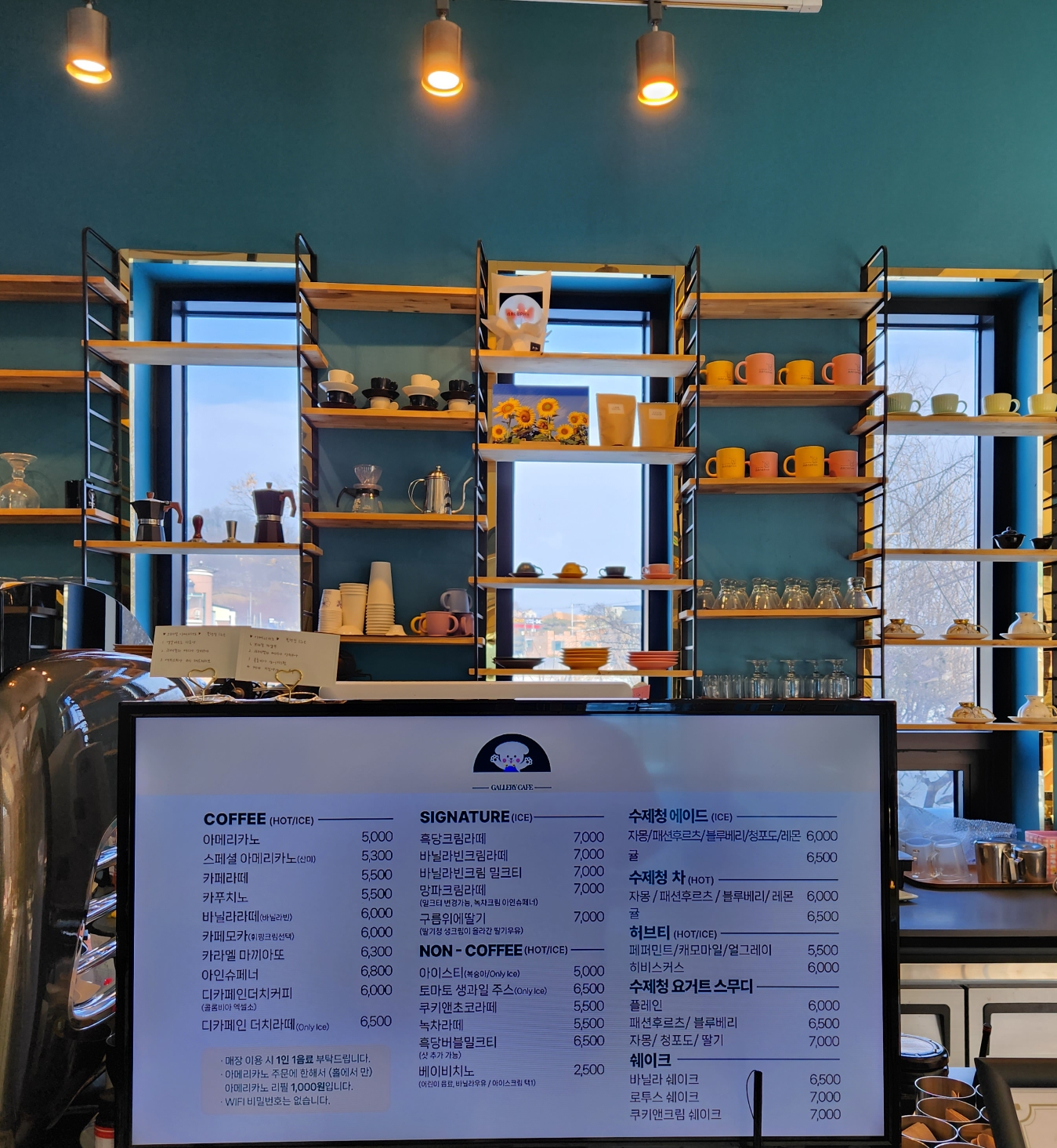 벽이나 2층에는 갤러리로 여러 멋진 사진들로 자리를 꾸미고 있다. 2층 에서는 앞에 탕정역이 보이는 뷰로 앉는것도 나쁘지 않았다.