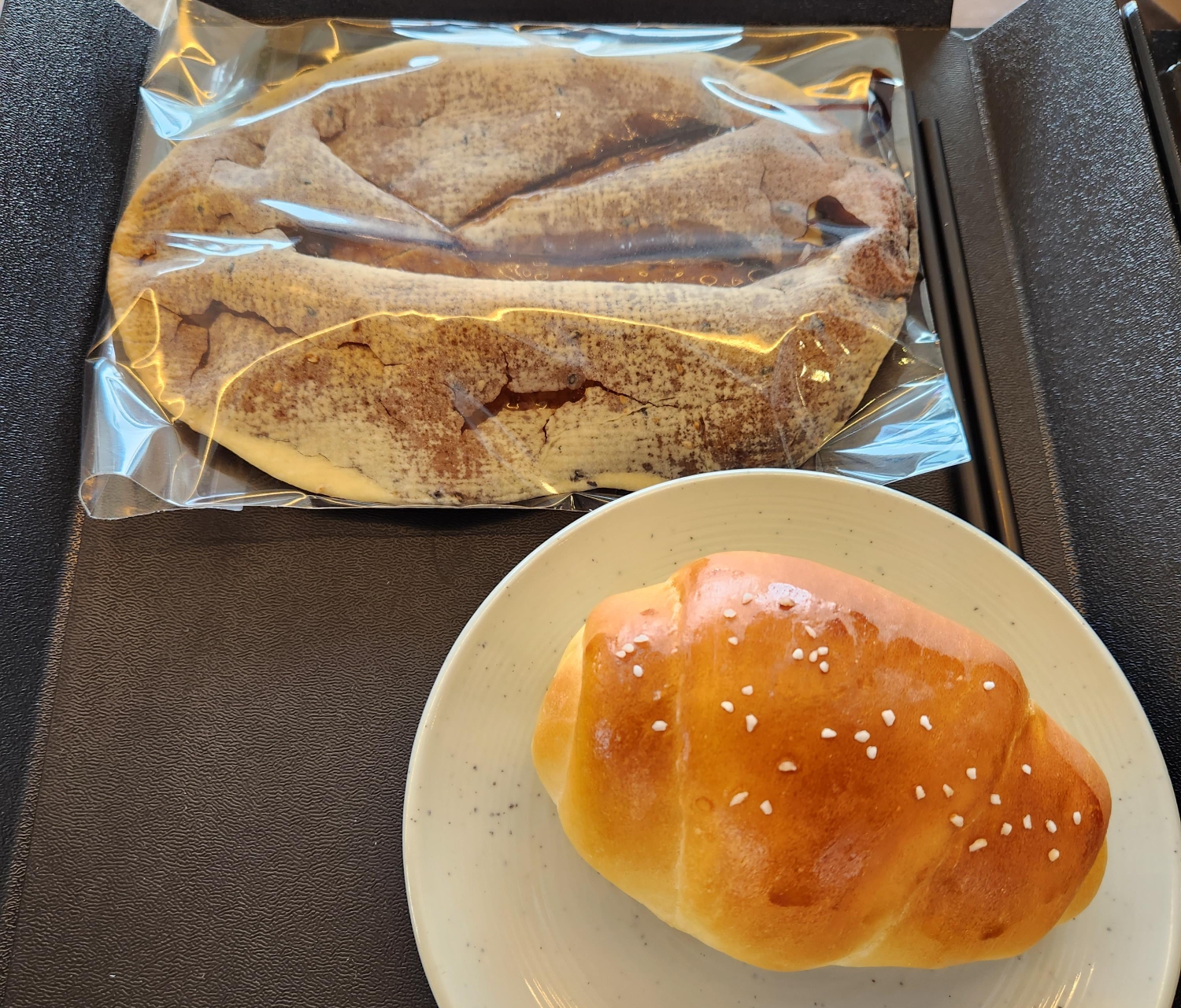 가장 핫 해보이는걸로 2가지를 주문했는데 소금빵과 흑당K 라고 적힌 빵으로 선택해서 먹어보았는데 주로 진한 단맛을 좋아하는 내 취향에서는 흑당K 는 바삭하면서도 진한 단맛 그대로 취향저격하였다. 😆