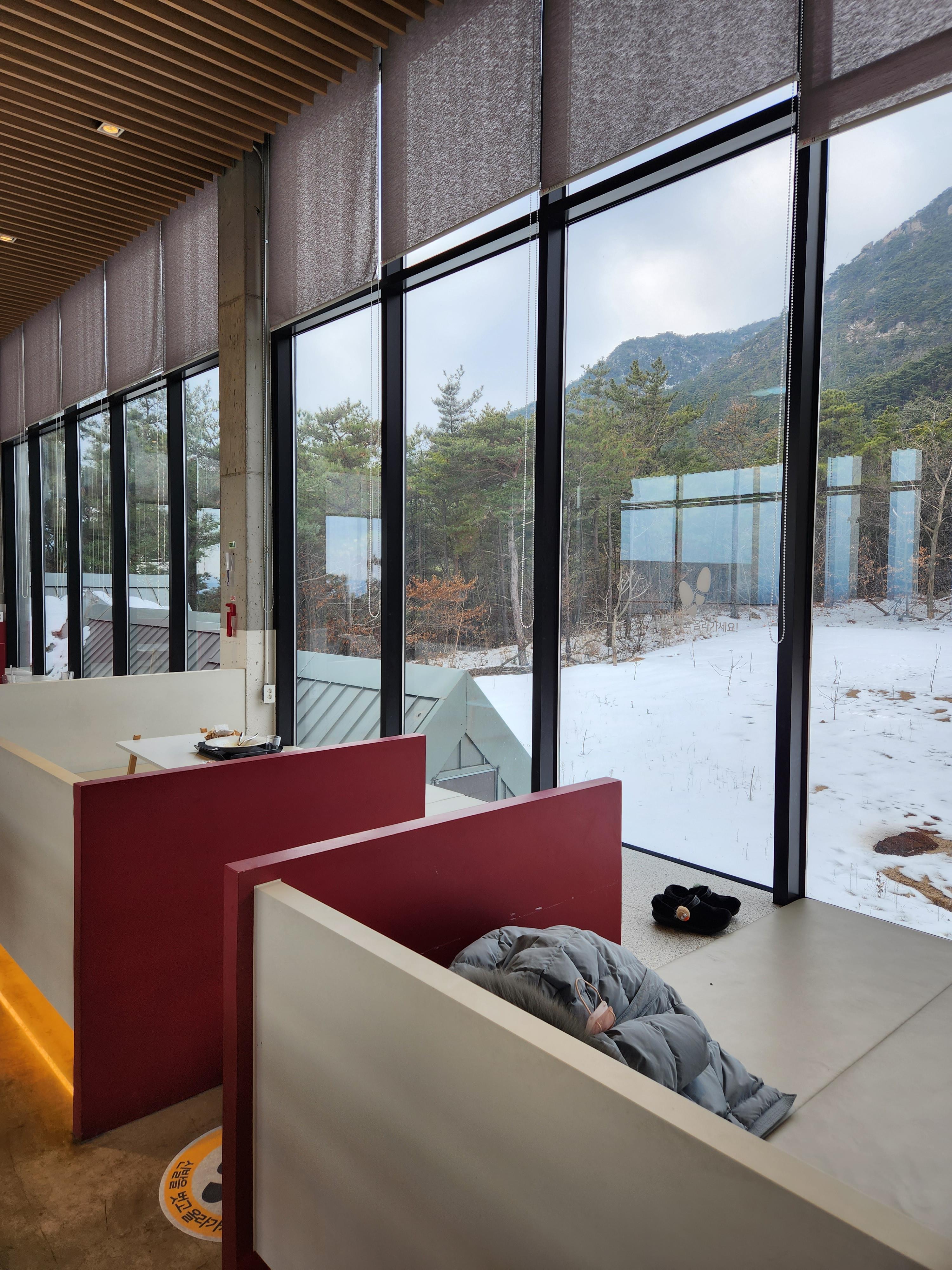 1층과 2층 사이에 공간으로 또 좌석들이 있고, 3층 옥상에는 눈오는 현재에는 이용하진 않지만 날이 좋은 날에는 뒤편으로는 산과 도시 아래 뷰를 보기에 좋은 자리로 사진 뷰도 좋을 듯 하다.
