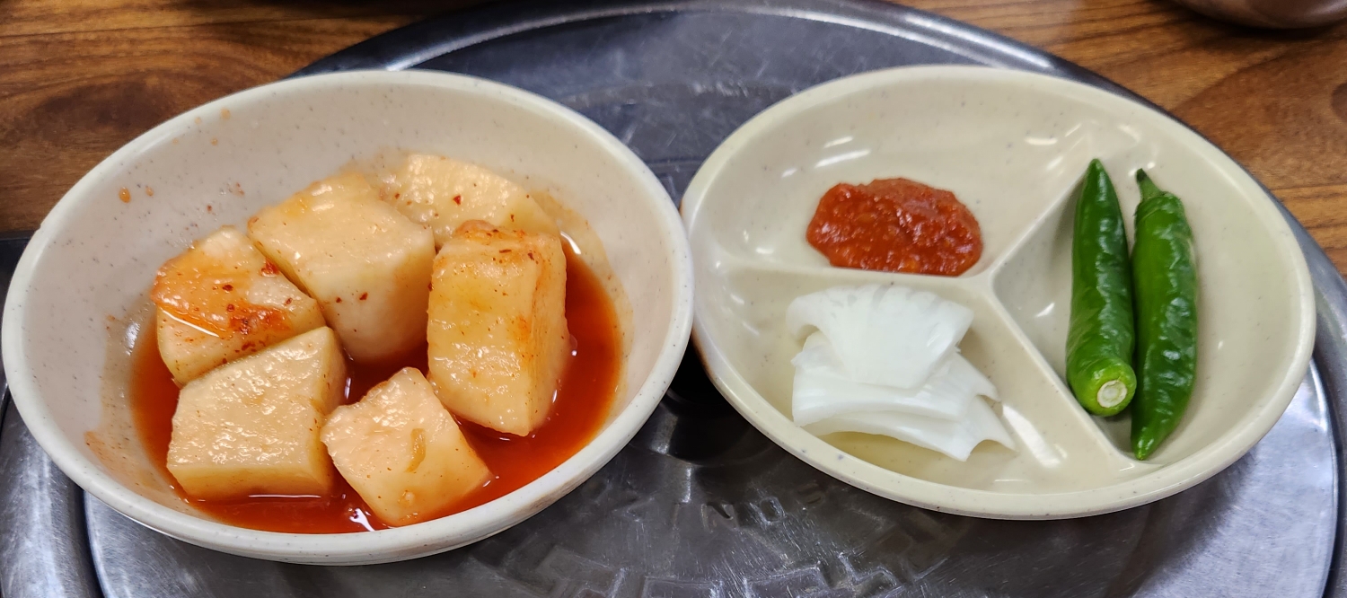 밑반찬은 깍두기, 양파, 고추등으로 일반적인 국밥에 나오는 밑반찬이다.