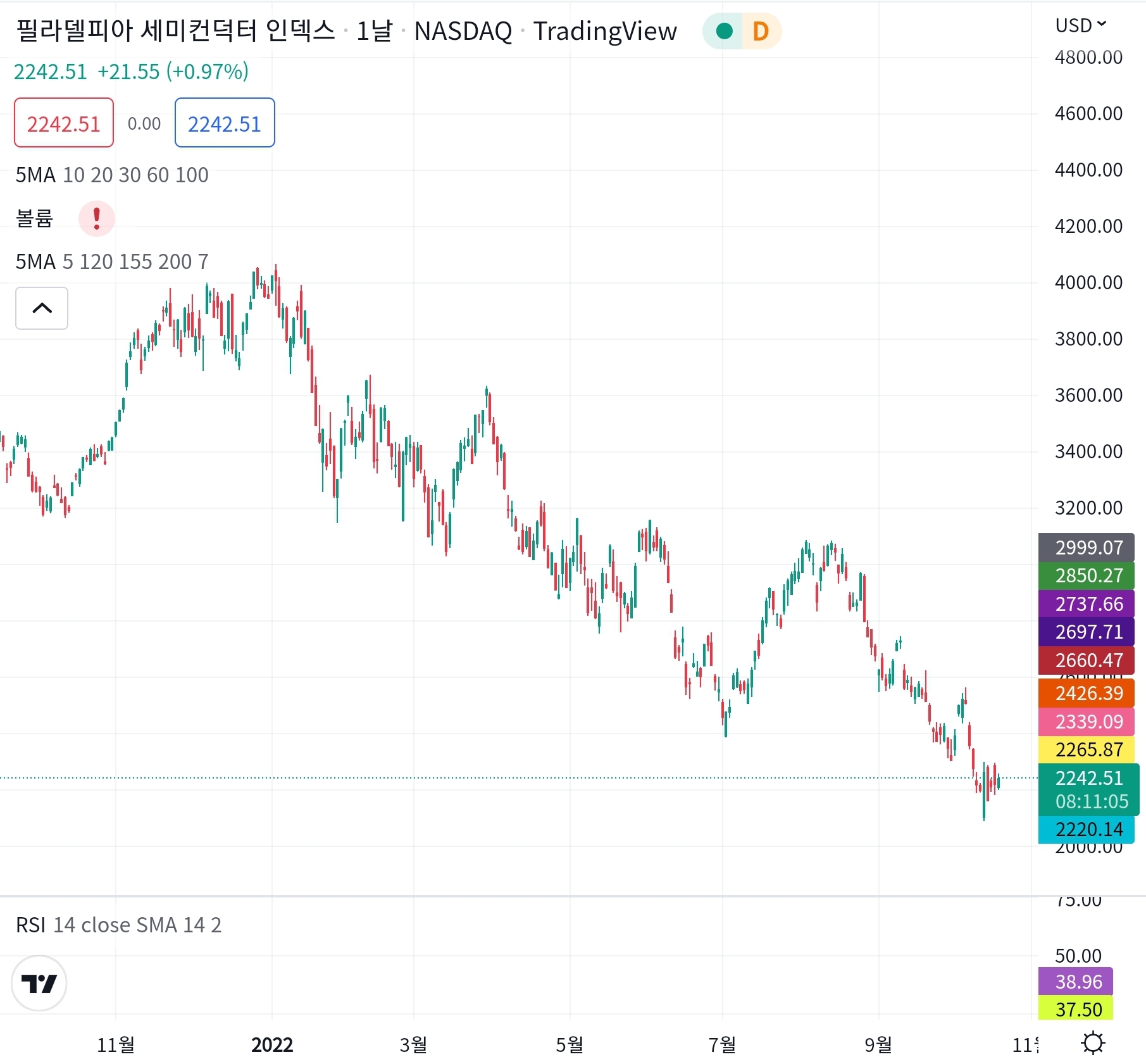현재 나스닥 지수 뿐 아니라 필라델피아 지수 또한 어디가 바닥일진 모르나 바닥권에서 흔히 비비고 있는 듯하다.