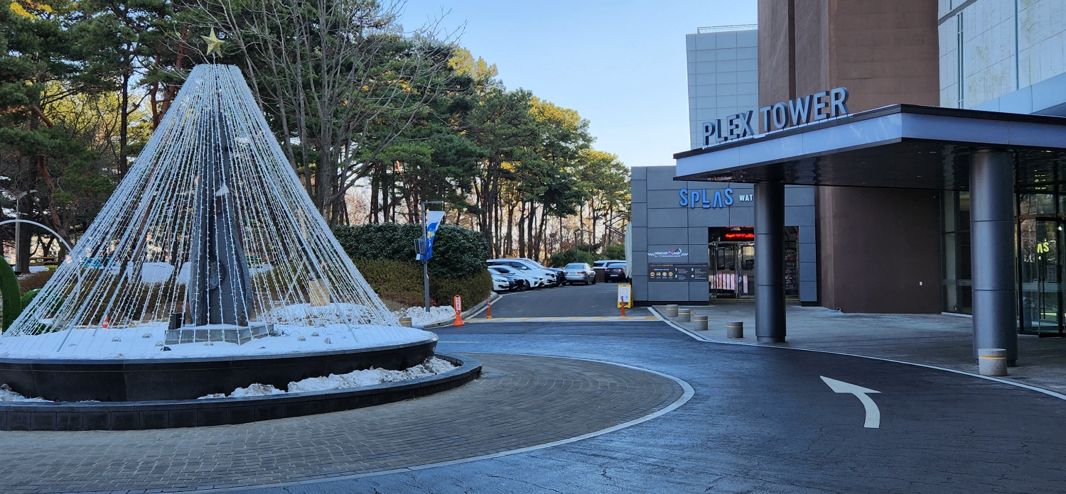 스플라스 리솜 리조트입구의 PLEX TOWER 라고 적힌 곳을 마주 보고 왼쪽에 워터파크 입구가 있다.